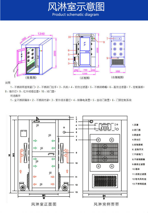 產(chǎn)品簡(jiǎn)介:風(fēng)淋室室人員進(jìn)出潔凈室的必經(jīng)通道,通用性強(qiáng)。主要用于電子加工、半導(dǎo)體行業(yè)、食品、飲料、生物、醫(yī)療等行業(yè)。是食品、飲料、生物、醫(yī)療行業(yè)QSGMP認(rèn)證必須使用產(chǎn)品。除人物表面附著塵埃的同事起到氣閘的作用。風(fēng)淋室是防止未經(jīng)凈化的空氣進(jìn)入潔凈區(qū)域的凈化設(shè)備。