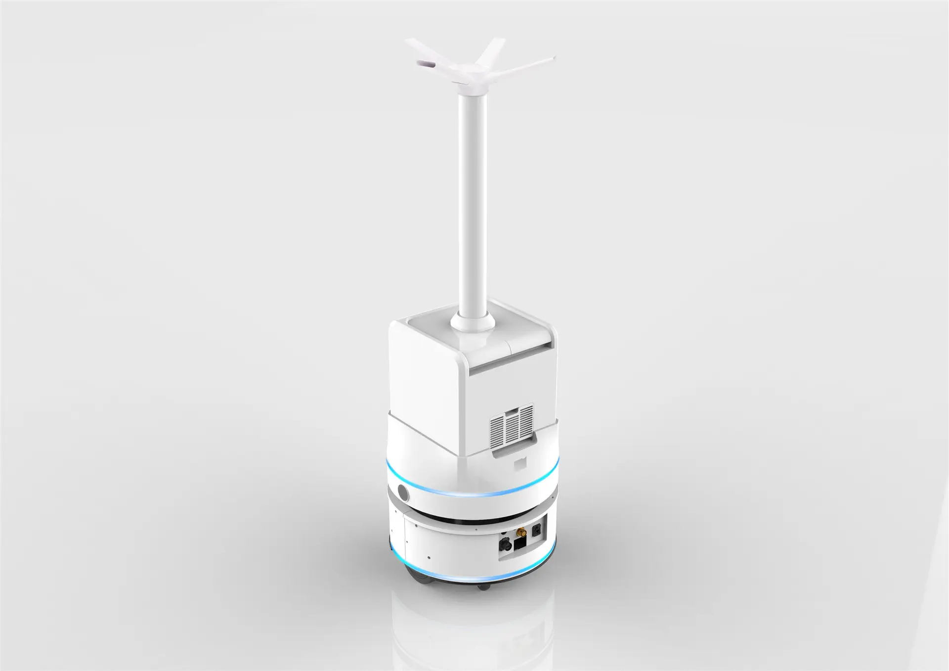 消毒防疫機(jī)器人簡(jiǎn)稱(chēng)消毒機(jī)器人,機(jī)器人為載體,在機(jī)器人內(nèi)部裝置消毒系統(tǒng),有霧化消毒機(jī)器人、紫外線(xiàn)消毒機(jī)器人、等離子消毒機(jī)器人、強(qiáng)光脈沖消毒機(jī)器人等。其中霧化消毒機(jī)器人應(yīng)用最為普遍,霧化消毒機(jī)器人是將消毒霧化,產(chǎn)生消毒氣體,利用機(jī)器人的氣動(dòng)系統(tǒng)···
